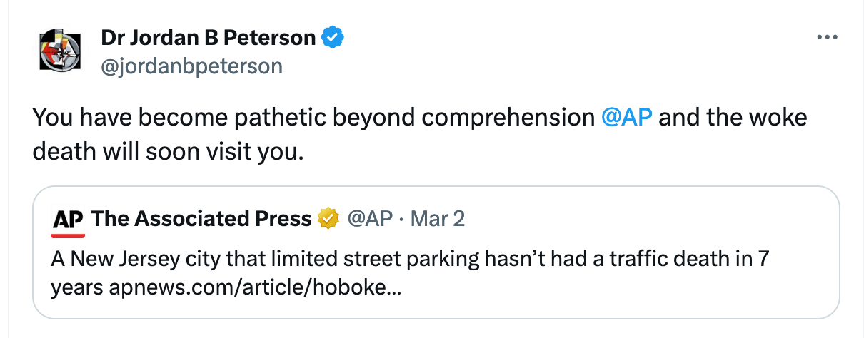 In Hoboken, New Jersey, adjustments to traffic enforcement and parking have resulted in a remarkable record: no traffic deaths on city-controlled streets in seven years. The major changes were narrowing intersections to slow traffic, and “daylighting,” or preventing cars from parking right next to a corner, which improves visibility. Noted conservative intellectual Jordan Peterson responded to AP News coverage of this milestone on Twitter with outrage: